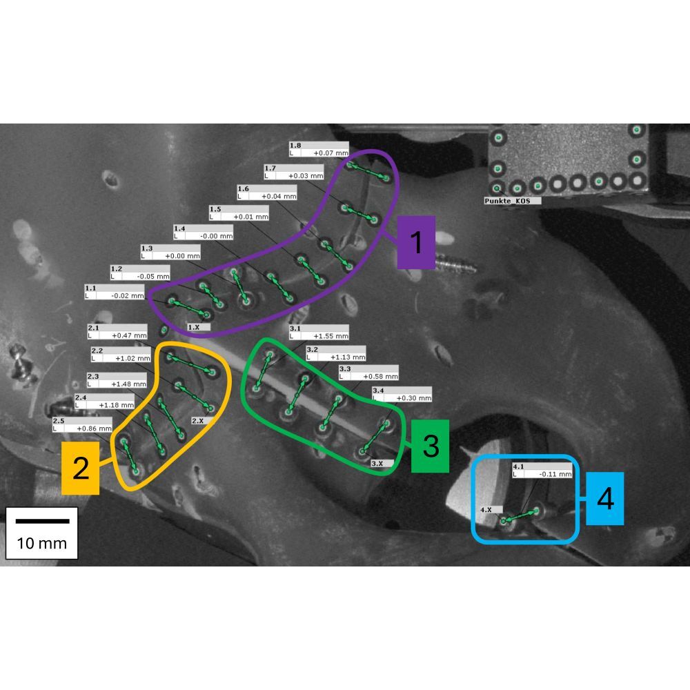 Anterior-column; Zone 3: Oblique to transverse fracture, and Zone 4: Ischiopubic ramus) were measured under increasing cyclic loading (100 cycles per load level) at 200 N, 400 N, 800 N, and 1200 N using an optical motion tracking system. A detected fracture gap of 1000 µm or more during/after the cyclic load was defined as fixation failure.